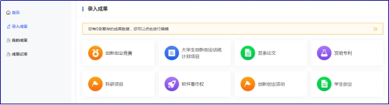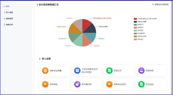 首页为各类成果数据汇总的饼图视图,点击“录入成果”可快速切换页面。