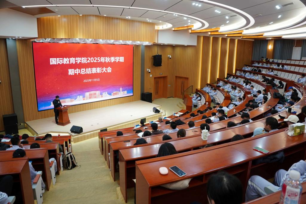 11月5日,国际教育学院2025年秋季学期期中总结表彰大会在3号楼101报告厅举行。国际教育学院分管日常工作副院长陈永庆、学院党委书记季志刚、党委副书记、纪委书记尹大伟、院团委书记张琨伟、全体兼职辅导员、助理辅导员、团学干部代表及各年级学生齐聚现场,总结半学期成果,表彰先进典型,共同明确下一阶段目标。会议由学工办主任张楠主持。