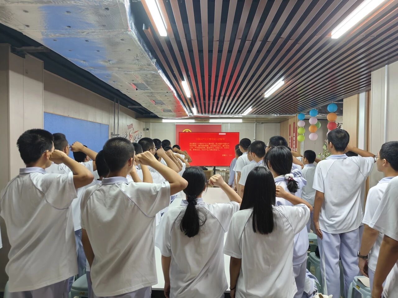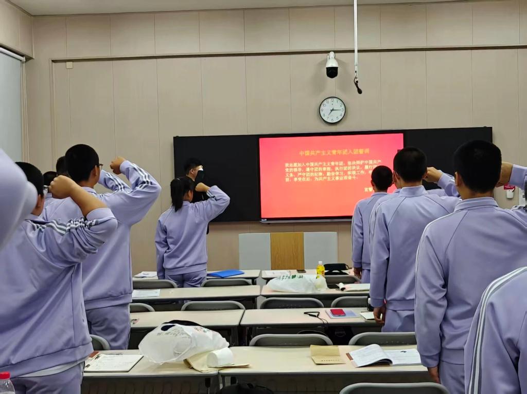 各位团员整齐列队,高举右拳面向团旗庄严宣誓。铿锵誓词回荡教室,既是对入团初心的回望,更是对“铭记历史、开创未来”的郑重承诺。