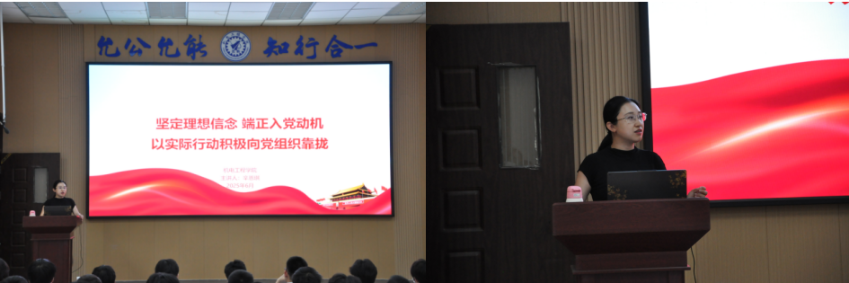 6月10日中午,机电工程学院党委在机械馆一楼报告厅组织第四期初级党课培训,学院学生第一支部书记辛恩琪以《坚定理想信念,端正入党动机,以实际行动积极向党组织靠拢》为主题,为学员们带来了一堂干货满满的培训课程。