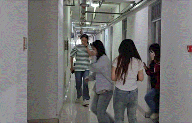 1、火情发现环节:由指定同学模拟发现火情,立即高声示警"着火了!大家快疏散!",同时通知相邻宿舍同学紧急撤离,并拨打校园110。