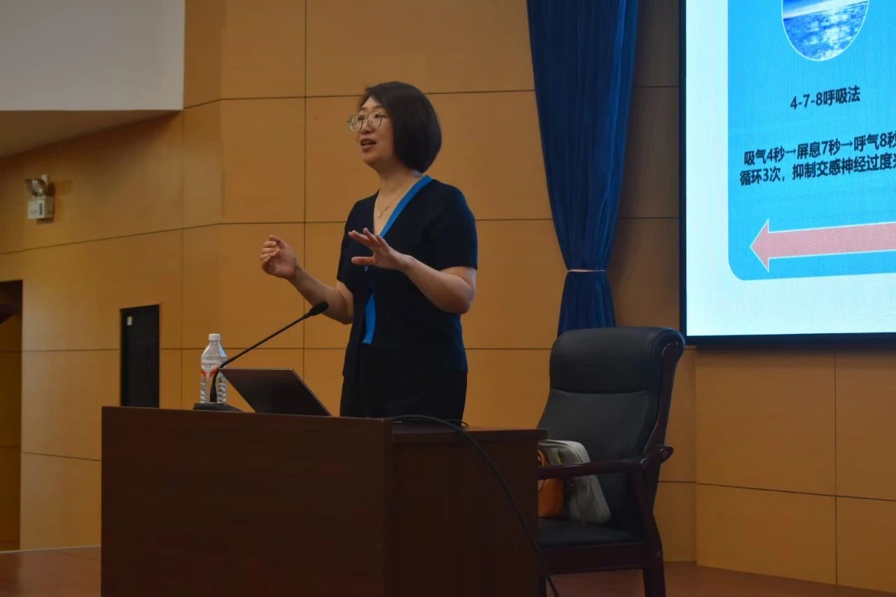 找出了问题,沈丽丽校友教我们一些常用且有效的能够缓解心理压力的方法。同学们实地跟随沈丽丽校友进行呼吸法,同学们逐渐舒张的表情,将内心中的负面情绪也轻轻呼散。除此之外沈丽丽校友还教了同学们握拳头来通过颤抖缓解压力,让同学们学到了简单但实用的解压小方法