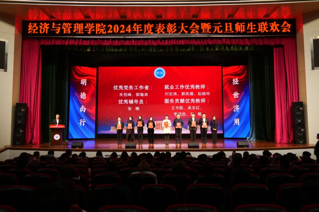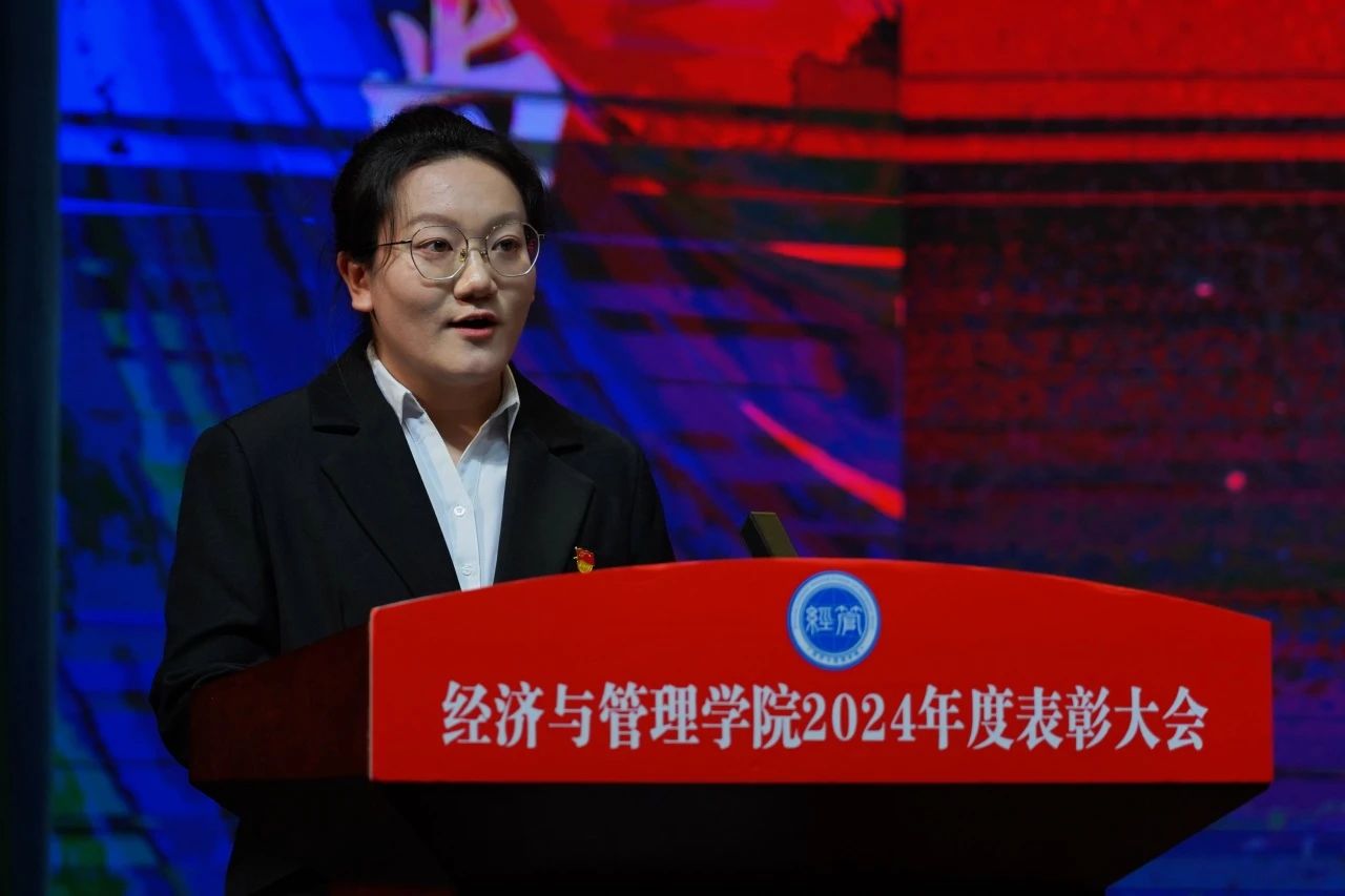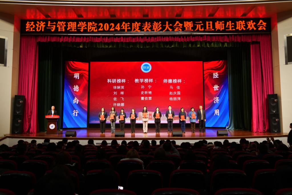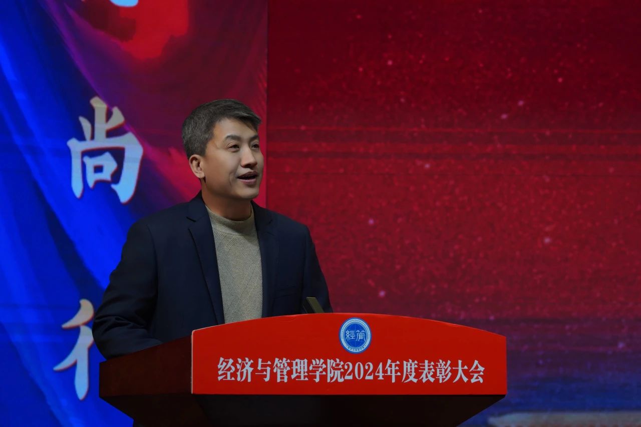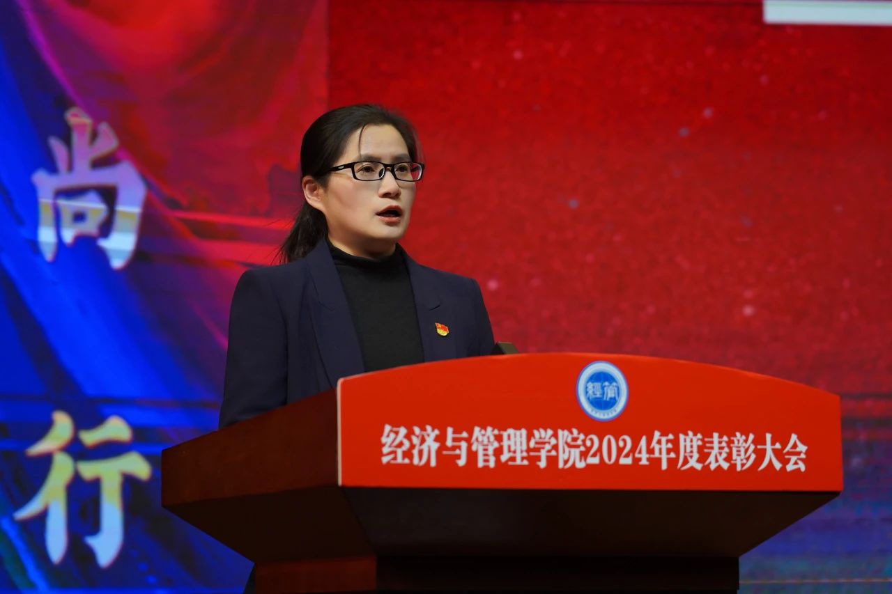 经济与管理学院党委书记高丹宣读2024年度经济与管理学院先进集体和先进个人等表彰名单,向努力学习提升自己的同学榜样提出表扬,对认真负责的优秀教师队伍给予肯定。