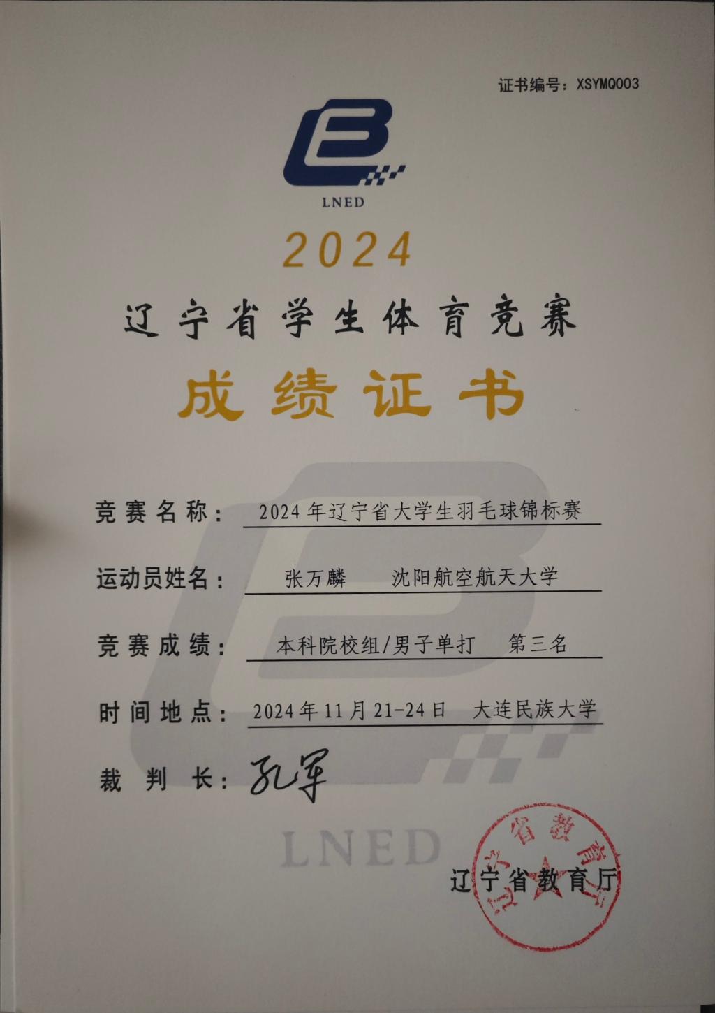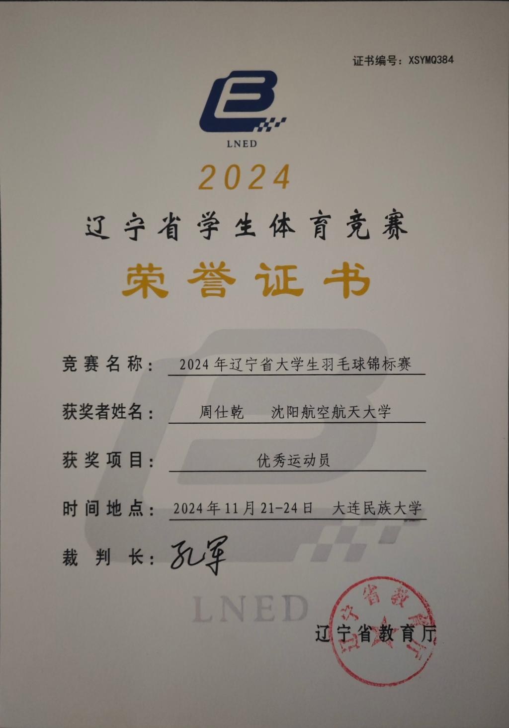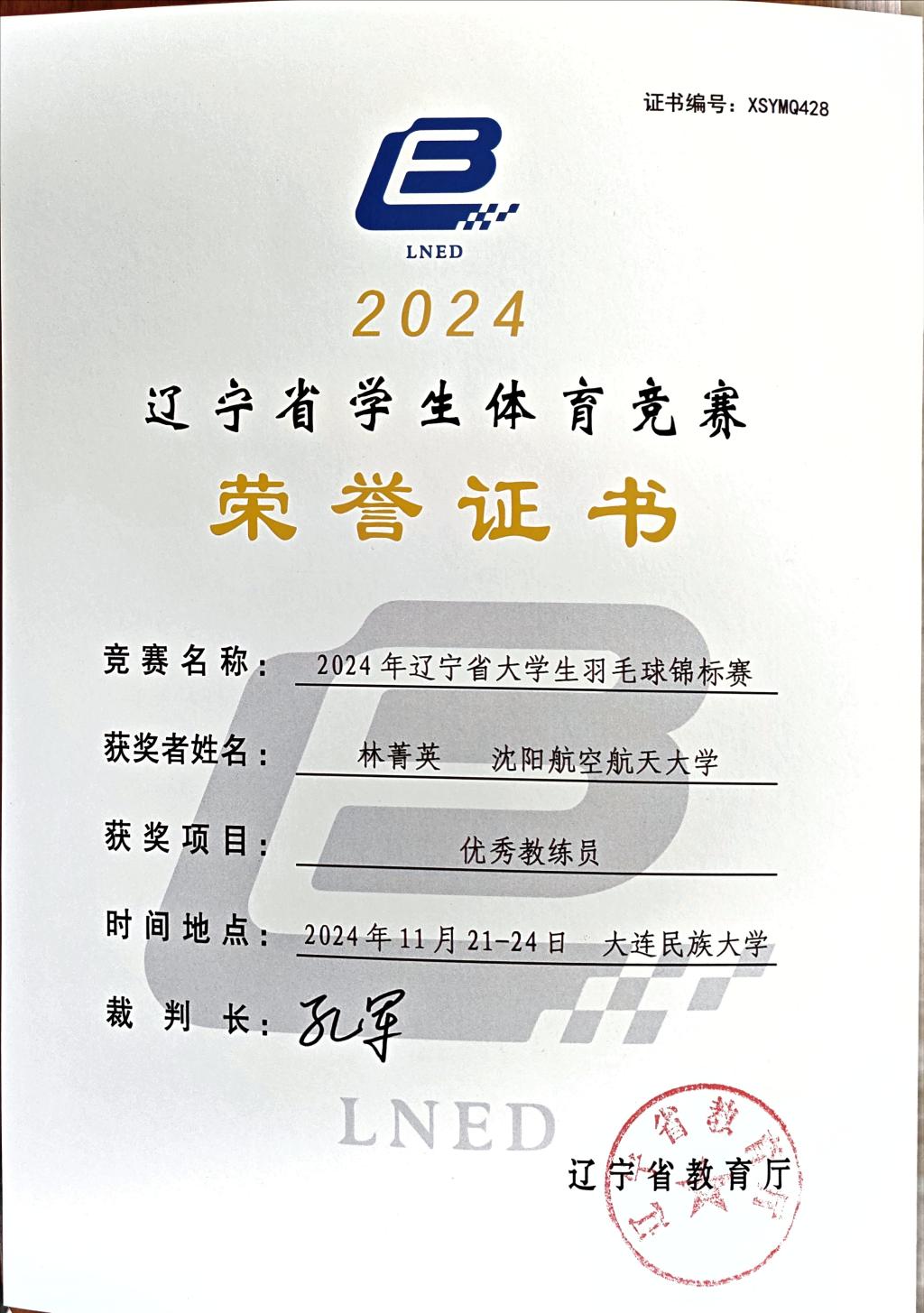 2024年11月,获2024年辽宁省大学生羽毛球锦标赛 获团体第三名,优秀教练员林菁英,本科组男子单打第三名,优秀运动员周仕乾